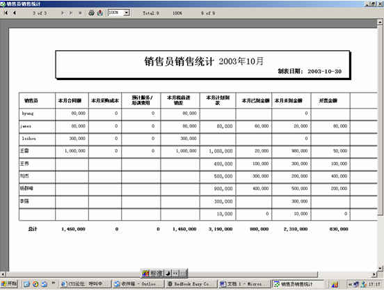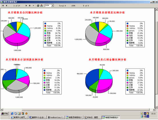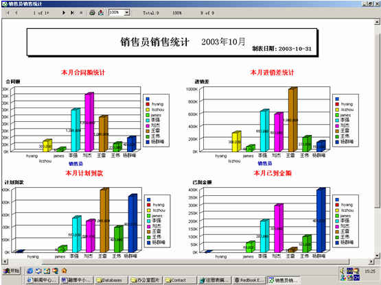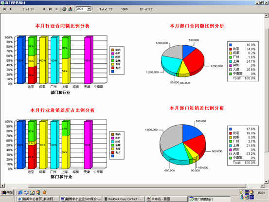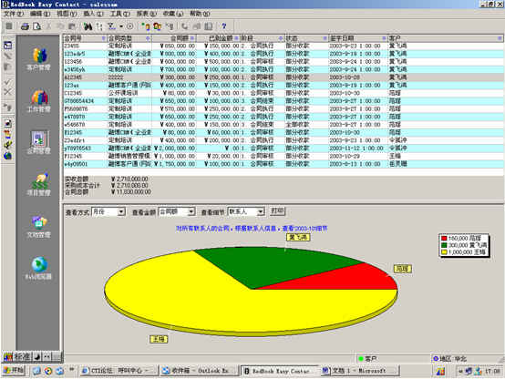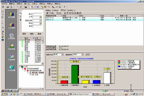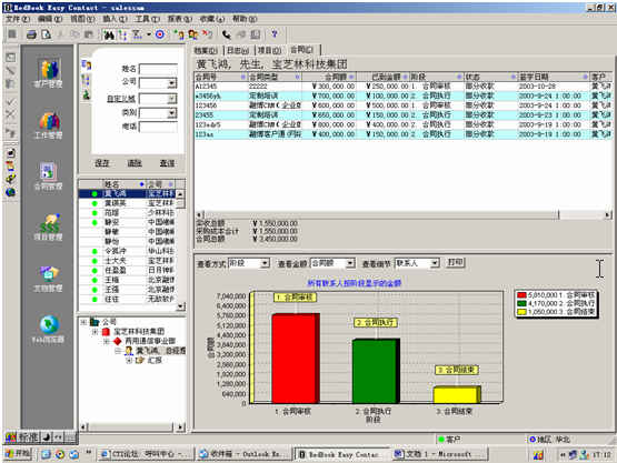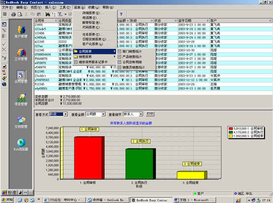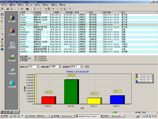 可對客戶(雇員)合同,根據(jù)合同階段、月份、合同金額、合同應(yīng)收應(yīng)付款、采購成本、客戶、銷售人員等條件進(jìn)行查詢和統(tǒng)計(jì), 查詢統(tǒng)計(jì)結(jié)果以詳細(xì)列表及圖示進(jìn)行顯示。