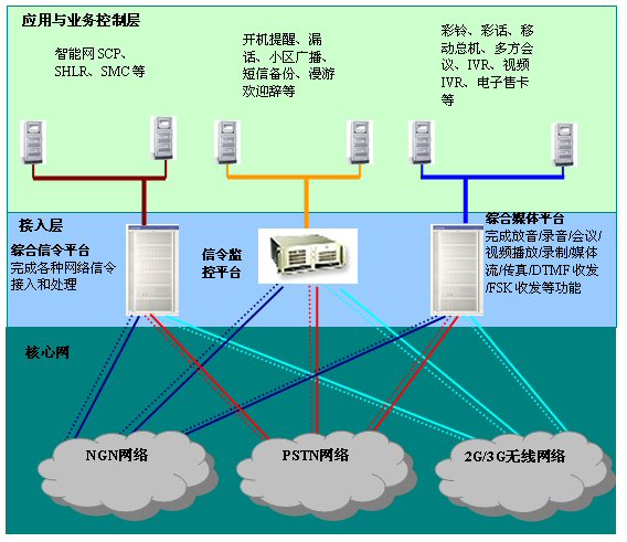 東方通信為增值業(yè)務開發(fā)商提供了全面的接入層解決方案,同一平臺全面提供2G/3G/NGN領(lǐng)域信令、交換、媒體處理功能,系列化產(chǎn)品滿足用戶不同容量的需求。平臺在網(wǎng)絡中的位置如下圖所示:
