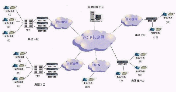 深圳市蓋威科技有限公司完整的語(yǔ)音解決方案如下,用一個(gè)網(wǎng)管平臺(tái)(AVS SERVER)來管理眾多企業(yè),各企業(yè)分支機(jī)構(gòu)間可以實(shí)現(xiàn)相互通話免話費(fèi),另外將企業(yè)內(nèi)部通話之外的電話通過網(wǎng)管平臺(tái)接入到電信營(yíng)運(yùn)商的VoIP