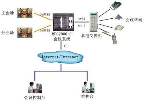 該會議系統(tǒng)通過4個數(shù)字中繼,與北電用戶交換機互連,采用七號信令。與視頻會議系統(tǒng)主會場采用四線音頻接口接主會場調(diào)音臺,保證與視頻會議系統(tǒng)音頻的無縫對接。通過以太網(wǎng)口與局域網(wǎng)連接,實現(xiàn)維護管理及會議控制等功能。