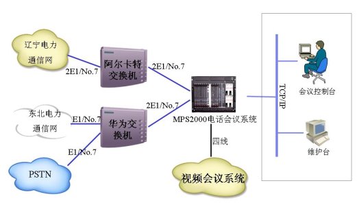 東北電網(wǎng)公司的電話會議系統(tǒng)中的120方會議橋通過4個E1采用中國七號信令與其原有的PABX相連,同時會議橋通過以太網(wǎng)與公司的內(nèi)部局域網(wǎng)相連,并在局域網(wǎng)內(nèi)設(shè)置一臺維護(hù)終端用于對系統(tǒng)的維護(hù)管理,局域網(wǎng)內(nèi)另一臺計算機(jī)可作為會議控制臺。電話會議終端直接與PABX相連。