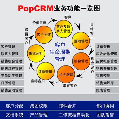 PopCRM吸收了國內(nèi)外先進的管理思想,以客戶的需求為根本,以應(yīng)用價值為核心,聚焦銷售環(huán)節(jié),對客戶資源統(tǒng)一管理,規(guī)范銷售行為;對銷售進行分析預(yù)測,提供決策依據(jù);對客戶進行全面分析,提供客戶關(guān)懷,吸引并留住客戶,全面提高企業(yè)的盈利能力。
