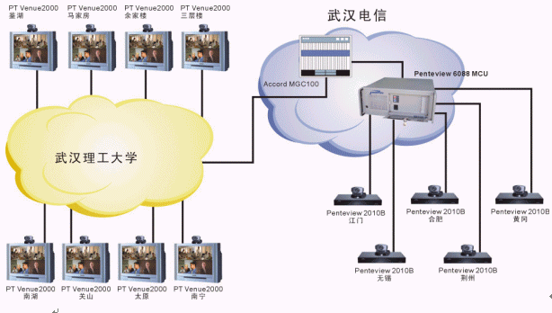 武漢理工大學(xué)的遠(yuǎn)程教學(xué)系統(tǒng)由于分3期建設(shè),網(wǎng)絡(luò)條件較為復(fù)雜。一期主要以PT的Venue2000終端+Accord MGC100 MCU為主,是一個(gè)H323系統(tǒng);二、三期采用中太多媒體的Penteview2010終端+Penteview6088MCU,是一個(gè)H320系統(tǒng),兩套系統(tǒng)通過網(wǎng)關(guān)無縫結(jié)合到一起工作,用戶根本感覺不到不同。各教室均同時(shí)采用了中太多媒體的遠(yuǎn)程教學(xué)支撐系統(tǒng),通過對Penteview會議電視系統(tǒng)的擴(kuò)充,實(shí)現(xiàn)了以下功能,使教學(xué)應(yīng)用更加方便: