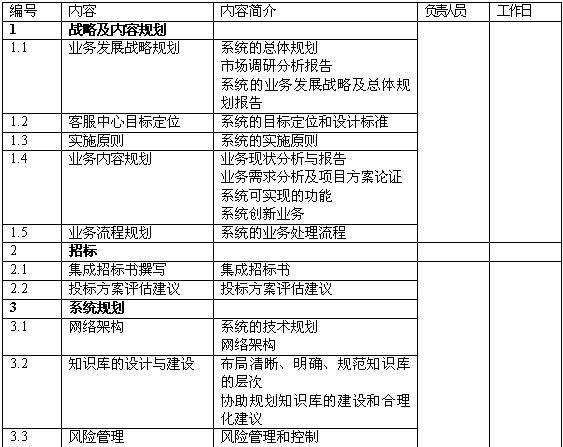 6.提出了未來客戶滿意度、分流柜面比率、產(chǎn)品促銷量等方面的量化比率;針對客服中心的主要業(yè)務提供量化的目標,并提出達成目標的前提條件;對未來人員和系統(tǒng)規(guī)模提供量化預估。