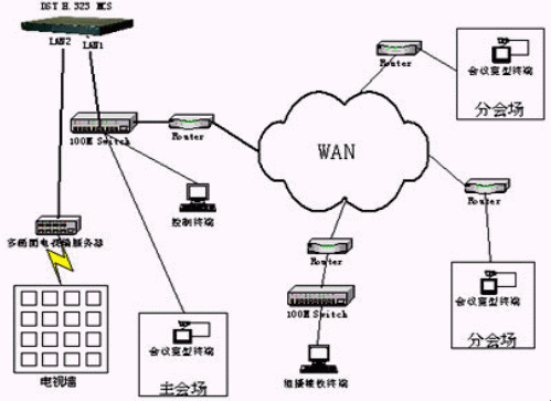 多點控制器采用鼎視通公司的DST H.323 MCS多點控制單元。DST H.323 MCS是鼎視通公司最新研制開發(fā)的高性能媒體交換設(shè)備,提供在分組交換網(wǎng)絡(luò)平臺之上的多種媒體交換服務(wù)。其面向的用戶既可以是企業(yè)、機關(guān)、學(xué)校等中小規(guī)模用戶,也可以是網(wǎng)絡(luò)運營商、業(yè)務(wù)提供商等大型用戶。并且它是唯一一款支持電視墻輸出的多點控制單元,同時結(jié)合鼎視通公司的多畫面電視墻服務(wù)器實現(xiàn)主會場電視墻的輸出。
