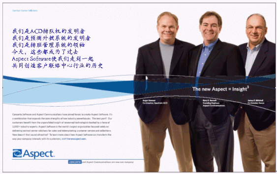 非常感謝您對(duì)科勝通軟件(Aspect Software)中國(guó)公司的支持,經(jīng)過(guò)一系列的收購(gòu)與合并,全球呼叫中心呼入技術(shù)的發(fā)明者,全球呼叫中心呼出技術(shù)的發(fā)明者,全球一體化聯(lián)絡(luò)中心系統(tǒng)的締造者,全球勞動(dòng)力管理排班系統(tǒng)的領(lǐng)導(dǎo)者,在世界高新技術(shù)飛速發(fā)展的今天,歷史性的走到了一起,誕生了全新的世界級(jí)呼叫中心的巨輪Aspect