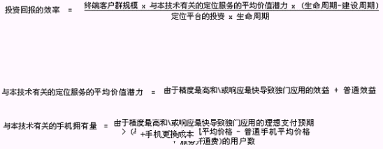 主要的因素有:終端客戶群的規(guī)模、定位平臺的投資、建設周期,請看下列公式(未經實際統(tǒng)計驗證,僅僅用于估算):