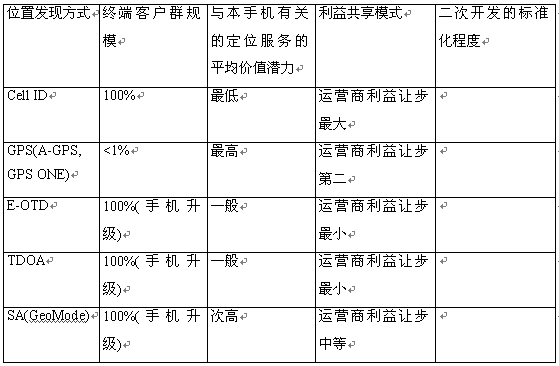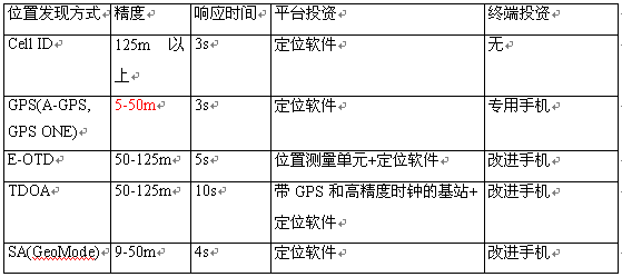 根據位置發(fā)現(xiàn)策略的不同,已經有很多的成熟技術可選---Cell ID、GPS(A-GPS = GPS + Cell ID)、TDOA/E-OTD/TDOA、SA(信號衰減,