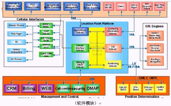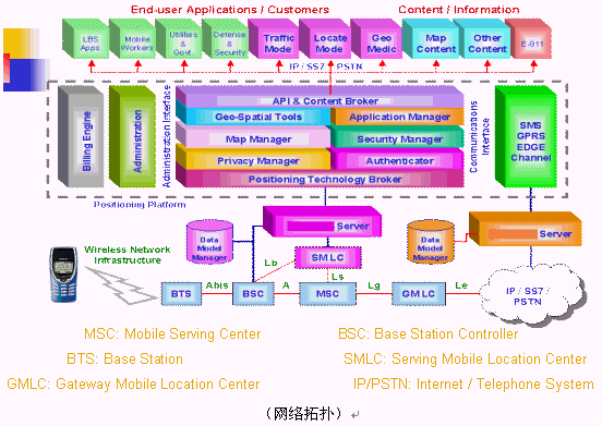 GeoMode定位技術的關鍵模塊由定位系統(tǒng)(SMLC/GMLC/STK+Server)、電子地圖信息系統(tǒng)(Map Manager)和增值服務應用系統(tǒng)(End-user