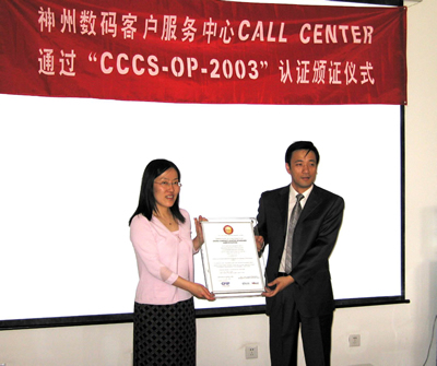 2005年6月2日,神州數(shù)碼呼叫中心通過了《全國呼叫中心運營績效標準》(CCCS-OP-2003)認證,并獲得由中國信息化推進聯(lián)盟客戶關系管理專業(yè)委員會頒發(fā)的認證證書(四星級客戶服務中心),成為國內(nèi)IT行業(yè)首家通過此認證的呼叫中心。