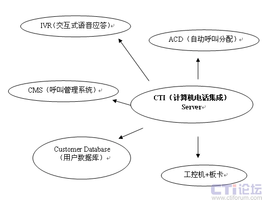 以CTI(計算機電話集成)為核心模塊,實現(xiàn)對IVR(交互式語音應(yīng)答)、ACD(自動呼叫分配)、CMS(呼叫管理系統(tǒng))、板卡+工控機、Customer