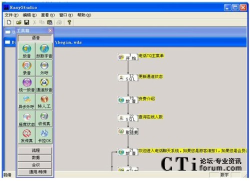 兩個集成環(huán)境,Easy Studio負(fù)責(zé)自動語音流程的編輯和調(diào)試,EasyAdmin負(fù)責(zé)對語音卡硬件的操作和按照EasyStudio生成的具體語音流程的實(shí)現(xiàn)。EasyCTI綜合實(shí)現(xiàn)了呼叫中心中IVR(Interactive
