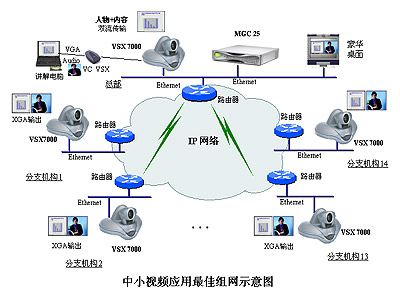 上圖為 Polycom MGC 25、VSX 7000及豪華桌面終端小型應(yīng)用組網(wǎng)示意圖。該產(chǎn)品組合具有業(yè)界最佳的音、視頻性能、功能指標(biāo),具有最優(yōu)的性價(jià)比。