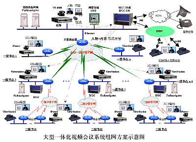 上圖為 Polycom 公司大型一體化視頻會議系統(tǒng)解決方案示意圖。Polycom公司是業(yè)界唯一可以提供端到端解決方案的公司。Polycom公司的視頻會議系統(tǒng)以其出色的性能,穩(wěn)定可靠的表現(xiàn)可以為大型企業(yè)、電信運營商提供一個完整的一體化解決方案。