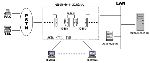 在一些小型CALL CENTER系統(tǒng)中,人們通常通過語音板卡加工控機(jī)的方式搭建系統(tǒng),通常一臺(tái)設(shè)備就集成了ACD、IVR、CTI等各種資源,各資源的使用、調(diào)派通過軟件進(jìn)行控制,有效的解決了建設(shè)成本高、系統(tǒng)構(gòu)造繁復(fù)的問題,具有相當(dāng)?shù)撵`活性。然而由于工控機(jī)和語音板卡容量有限,同時(shí)其標(biāo)準(zhǔn)最多只能是工業(yè)級(jí)標(biāo)準(zhǔn),因此在構(gòu)建相對大型的呼叫中心時(shí)就總是捉襟見肘。為了增加系統(tǒng)容量,解決多臺(tái)PC之間進(jìn)行通道交換的難題,人們又設(shè)計(jì)了過機(jī)卡和過機(jī)線來解決,其應(yīng)用系統(tǒng)如下圖: