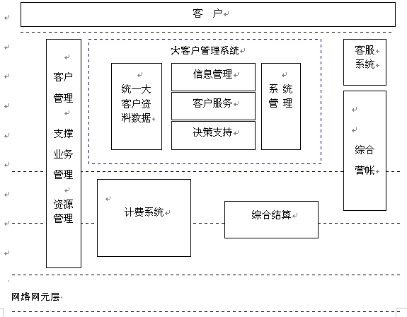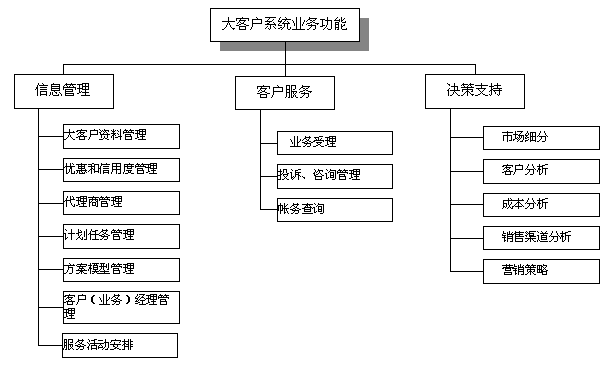 電信大客戶管理系統(tǒng)是在收集大客戶市場調(diào)查信息、大客戶資料信息、大客戶經(jīng)營戰(zhàn)略資源的基礎(chǔ)上,自動采集專業(yè)計(jì)費(fèi)、綜合營帳、客服、網(wǎng)管、財(cái)務(wù)等系統(tǒng)的相關(guān)數(shù)據(jù),實(shí)現(xiàn)快速、全面、準(zhǔn)確的新客戶業(yè)務(wù)受理、新增需求受理及故障處理過程通道,實(shí)現(xiàn)完善的客戶經(jīng)理管理、代理商管理系統(tǒng),最終實(shí)現(xiàn)完整的大客戶滿意度評估體系和針對大客戶的個性化服務(wù)。建成后的系統(tǒng)從管理、服務(wù)、分析三方面出發(fā)主要應(yīng)具備信息管理、客戶服務(wù)、決策支持功能。