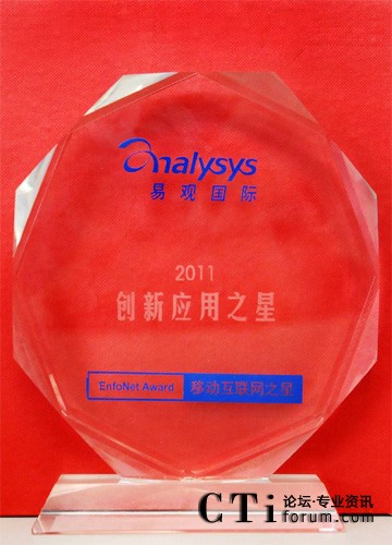 易觀國(guó)際成立于2000年,是中國(guó)信息化、互聯(lián)網(wǎng)和新媒體以及電信運(yùn)營(yíng)行業(yè)規(guī)模最大的中國(guó)科技市場(chǎng)領(lǐng)先的研究和咨詢(xún)機(jī)構(gòu)。2011易觀“EnfoNet Award–移動(dòng)互聯(lián)網(wǎng)之星”評(píng)選是易觀年度產(chǎn)業(yè)盛會(huì)——首屆移動(dòng)互聯(lián)網(wǎng)博覽會(huì)暨第四屆易觀移動(dòng)互聯(lián)網(wǎng)年會(huì)的重要組成部分,是易觀國(guó)際(Analysys International)為推薦中國(guó)互聯(lián)網(wǎng)及移動(dòng)互聯(lián)網(wǎng)產(chǎn)業(yè)中表現(xiàn)優(yōu)異且具備發(fā)展?jié)摿Φ钠脚_(tái)及應(yīng)用而設(shè)立。