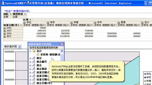 可以利用SynleadCRM企業(yè)版提供的在線聯(lián)機(jī)分析工具實(shí)現(xiàn),也可以導(dǎo)出到EXCEL中,利用EXCEL的有關(guān)功能實(shí)現(xiàn)。OLAP在線聯(lián)機(jī)分析,屬于商業(yè)智能BI的組成部分之一,它允許您對數(shù)據(jù)進(jìn)行任意的上鉆、下鉆,旋轉(zhuǎn)、切片、切塊,得到更豐富的、更有價(jià)值的圖表和報(bào)表。