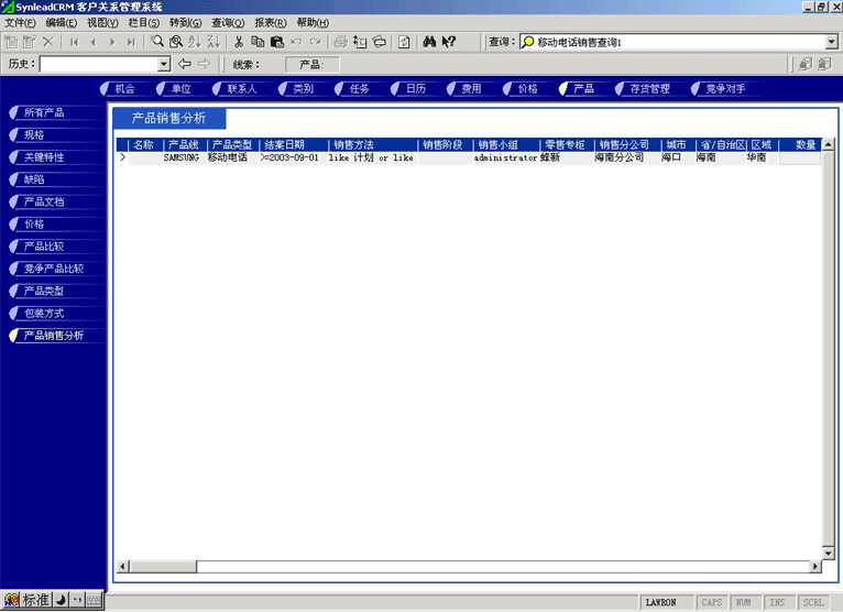 管理人員可能需要對比產(chǎn)品銷售計(jì)劃與實(shí)際銷售的產(chǎn)品數(shù)量的關(guān)系,也有可能要對比某款產(chǎn)品與競爭產(chǎn)品銷售的情況,這時(shí)候可以利用產(chǎn)品銷售統(tǒng)計(jì)功能。它最大的好處是各項(xiàng)目數(shù)據(jù)普遍關(guān)聯(lián),允許任意組合查詢條件(見圖4,點(diǎn)擊下圖,可彈出更清晰的大圖)