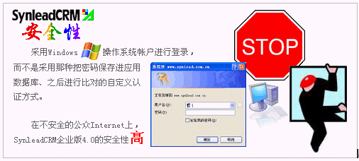 SynleadCRM企業(yè)版4.0采用了高度捆扎操作系統(tǒng)安全性的域帳戶認(rèn)證,而不是在應(yīng)用層面自定義用戶認(rèn)證策略。事實(shí)上,SynleadCRM從一開(kāi)始就基于這種安全機(jī)制并且不斷完善,以避免今后無(wú)法向更高端邁進(jìn)。