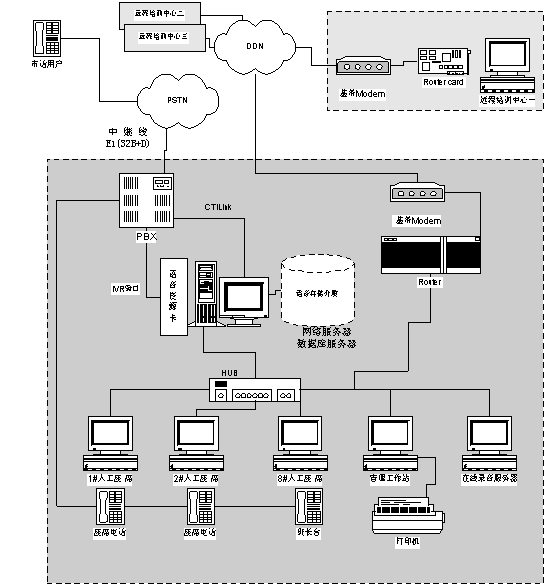 北京強(qiáng)訊恒通網(wǎng)絡(luò)技術(shù)公司通過利用該學(xué)院現(xiàn)有的計算機(jī)局域網(wǎng),根據(jù)該學(xué)院業(yè)務(wù)需求專門為800服務(wù)熱線設(shè)立了一組服務(wù)座席,每個座席都有座席電腦。所有撥打800熱線的電話通過CTI服務(wù)器的ACD系統(tǒng)分配到服務(wù)組最適合的座席。如該服務(wù)組暫時沒有空閑座席,則語音提示用戶等待并播放音樂,一旦有座席空閑則自動將該用戶電話轉(zhuǎn)接到空閑座席。當(dāng)有外線進(jìn)來接通到某個座席時,系統(tǒng)自動彈出該電話用戶的客戶資料。