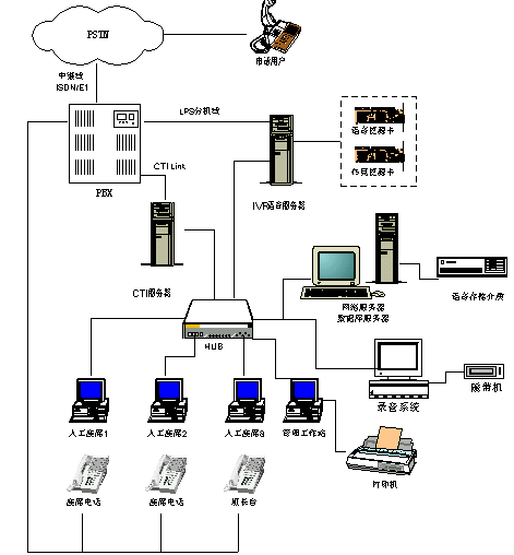 CTI服務(wù)器是一臺(tái)與交換機(jī)相聯(lián)的計(jì)算機(jī)(建議采用工控機(jī)),它通過接收來(lái)自交換機(jī)的事件/狀態(tài)消息和向交換機(jī)發(fā)送命令,實(shí)現(xiàn)計(jì)算機(jī)對(duì)電話、呼叫、分組、引導(dǎo)和中繼線全面控制,