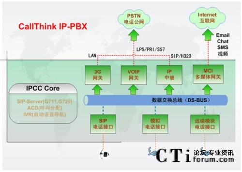 IPCC Core是IP-PBX的核心部分,提供了配置IP分機號碼(Extension Number)、功能按鈕以及通話管理和ACD路由策略功能;它可以支持多達(dá)1000個IP語音終端呼叫請求,通過分組交換,實現(xiàn)IP分機、普通分機、互聯(lián)網(wǎng)上IP電話之間的互聯(lián)互通;通過Voip網(wǎng)關(guān),可以實現(xiàn)IP網(wǎng)絡(luò)和傳統(tǒng)電路交換電話網(wǎng)的通信,完成異種網(wǎng)絡(luò)的電話呼入和呼出;