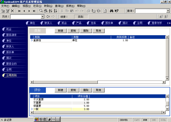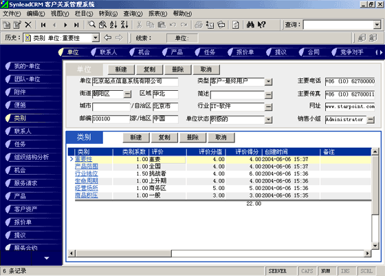 客戶單位的分類較聯(lián)系人的分類更復(fù)雜。常用的分類有:按照企業(yè)規(guī)模來分類(大、中、小,層次自定義,下同)、按照該客戶與本單位的緊密程度分類(緊密、普通、疏遠(yuǎn))、按照該客戶的重要性分類(重要、普通、次要)、按照該客戶的忠誠度分類(忠誠、普通、游移)。有一些用戶企業(yè),希望對(duì)客戶單位特征進(jìn)行采集,進(jìn)而進(jìn)行客戶信用評(píng)價(jià)。信用特征的類別可以多達(dá)數(shù)十種類(詳細(xì)情況可參考有關(guān)書籍)。利用SynleadCRM,您可以為每個(gè)類指定系數(shù),為類下屬的每個(gè)評(píng)價(jià)指定評(píng)分分值。例如,您可以建立一個(gè)類別為"客戶倉庫積壓商品的情況",系數(shù)為1,該類別下屬的評(píng)價(jià)有"很多1分"、"一般3分"、"少1分"、"未知0分",如果指定某客戶該類別的評(píng)價(jià)為一般,則該項(xiàng)目得分為3分*1(系數(shù))=3分。依此類推,您還可以指定更多的分類與評(píng)價(jià),例如:客戶經(jīng)營場所所處的位置、客戶在企業(yè)生命周期中所處的位置、客戶在行業(yè)中的地位、客戶產(chǎn)品的組合情況、客戶產(chǎn)品覆蓋的市場范圍、客戶產(chǎn)品的淡旺季規(guī)律、客戶近年?duì)I業(yè)額的增減趨勢、客戶的年度營業(yè)額、客戶的現(xiàn)金周轉(zhuǎn)能力、客戶的負(fù)債情況、客戶是否涉及中大訴訟等。每一個(gè)類別項(xiàng)目的評(píng)分經(jīng)過系數(shù)的加權(quán)運(yùn)算后,可以求和,得到這個(gè)客戶的總評(píng)分。未來也可以利用分析模型對(duì)此類數(shù)據(jù)進(jìn)行進(jìn)一步的分析,提供輔助決策所需要的圖表和報(bào)表。