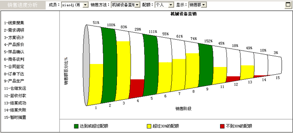 圓錐體上方每個階段都對應(yīng)一個百分比數(shù)值,表示當(dāng)前各個銷售階段的銷售額與該階段任務(wù)指標(biāo)的比率。例如假設(shè)"線索搜集"階段的任務(wù)指標(biāo)是100,000元,當(dāng)前的比率是51%,則表示當(dāng)前處于"線索收集"階段的機會的銷售額之和是51,000元。如果銷售額/任務(wù)指標(biāo)的值小于30%,則以紅色塊表示;如果值介于30%~100%則以黃色塊表示,如果值大于或等于100%,則以綠色塊表示。