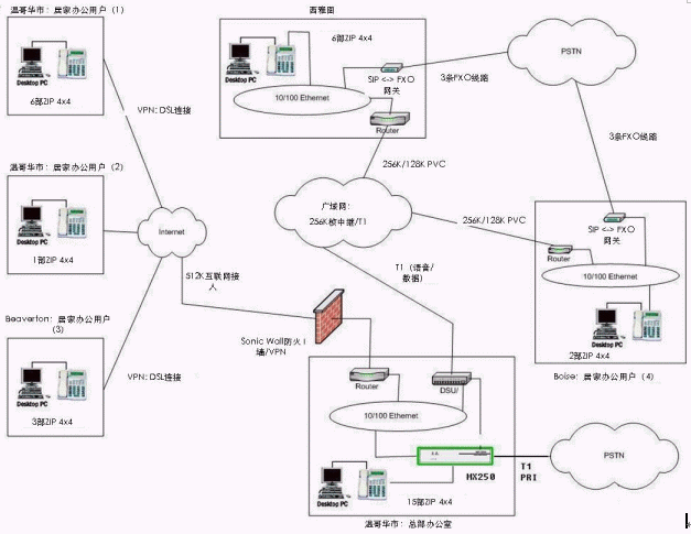 系統(tǒng)的安裝是由蘇迪思科技公司的認(rèn)證增值分銷商Xiologix 來實(shí)現(xiàn)的。在45分鐘內(nèi)Xiologix 的工程師就設(shè)定和調(diào)試完畢MX250并且完成了第一期20部蘇迪思ZIP4x4 IP電話的安裝。一個月后Consani Associates公司又進(jìn)行了系統(tǒng)擴(kuò)展追加了30個用戶許可和另外30部ZIP4x4 IP電話。Consani Associates 公司采用蘇迪思科技的MX250系統(tǒng)后的公司系統(tǒng)網(wǎng)絡(luò)拓樸圖如下: