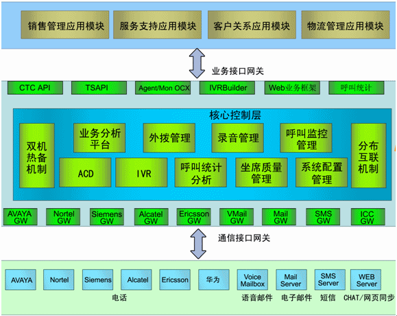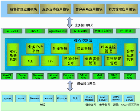 核心控制層:ACD、IVR、呼叫統(tǒng)計分析、坐席質(zhì)量管理、系統(tǒng)配置管理、業(yè)務分析平臺、預測外撥管理、工作流平臺、坐席資源管理、分布互連機制、雙機熱備機制;