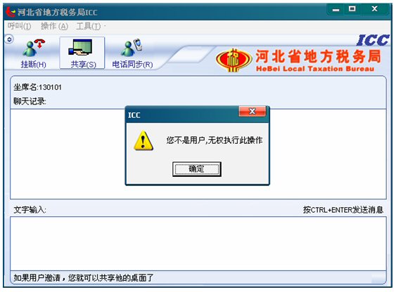 7. 遠(yuǎn)程共享:考慮到對(duì)納稅人電腦的安全保護(hù),座席端沒(méi)有權(quán)利主動(dòng)共享納稅人的桌面,即坐席不能點(diǎn)擊共享按鈕,如果點(diǎn)擊,將彈出對(duì)話框友好提示:“您不是納稅人,無(wú)權(quán)執(zhí)行此操作”如下圖: