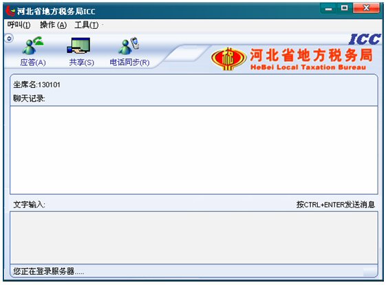 2. 點(diǎn)擊12366界面下面一行按鈕中的ICC按鈕,運(yùn)行起來(lái)ICC。出現(xiàn)ICC界面,此時(shí)ICC處于登錄服務(wù)器狀態(tài),左下角的狀態(tài)欄有文字提示“您正在登錄服務(wù)器……”。聊天記錄對(duì)話框的上面有坐席名,例如“坐席名:130101”如下圖: