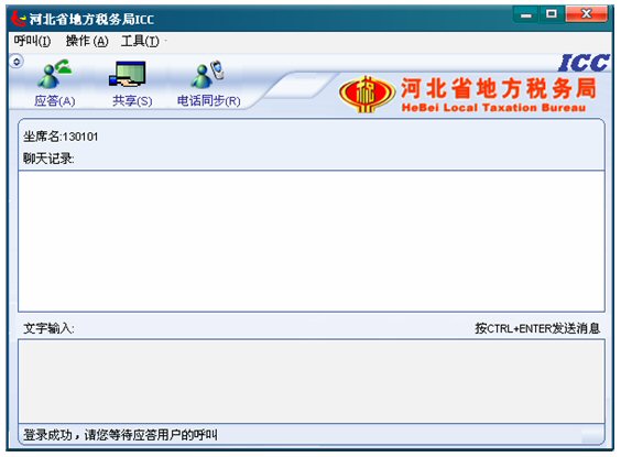 3. 稍等片刻,ICC登錄成功,此時(shí)坐席就可以等待納稅人的呼叫了,左下角狀態(tài)欄有文字提示“登錄成功,請(qǐng)等待應(yīng)答用戶的呼叫”。如下圖: