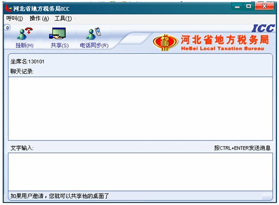 收到納稅人共享請(qǐng)求提示,如果坐席現(xiàn)在為全屏,收到納稅人共享請(qǐng)求,ICC界面將會(huì)自動(dòng)跳到全屏的前端,彈出共享框。如果坐席現(xiàn)在不是全屏,收到納稅人共享請(qǐng)求,任務(wù)欄里ICC對(duì)話框?qū)⒆詣?dòng)閃爍,彈出共享框。