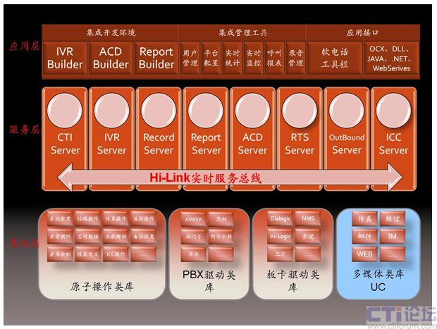 在擁有第五代呼叫中心Hi-Link核心軟件的商路通公司看來,呼叫中心軟件架構(gòu)包含三層,基礎(chǔ)層、服務(wù)層和應(yīng)用層。而統(tǒng)一通信UC應(yīng)從劃入基礎(chǔ)層及服務(wù)層之中,PBX驅(qū)動類庫和板卡驅(qū)動類庫處理電話媒體的請求,而多媒體類庫用于處理其他統(tǒng)一通信的媒體,如傳真、短信、電子郵件、均包含在多媒體類庫之中。傳真、短信、電子郵件等請求分別由FAX