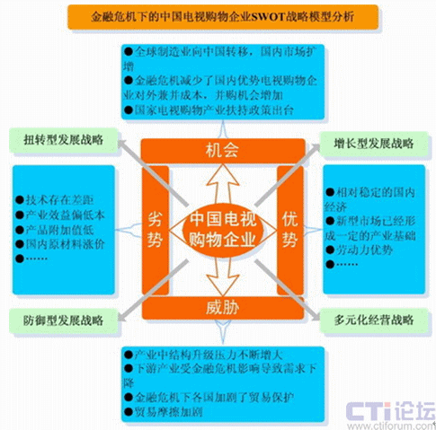 1992年至2009年以來,電視購物經(jīng)歷了從割據(jù)到統(tǒng)一,全國購物頻道網(wǎng)絡化;從粗放到科學,頻道運營模式專業(yè)化;從簡介到深度,頻道編排方式規(guī)律化、從滯后到及時,物流配送體系成熟化。電視購物被譽為繼零售、超市之后的第三次銷售革命,電視購物將成為金融危機經(jīng)濟形態(tài)下未來中國電視新的經(jīng)濟增長點,而付費電視、數(shù)字網(wǎng)絡電視的發(fā)展,是中國電視購物市場新的戰(zhàn)略機會。金融危機下的中國電視購物企業(yè)SWOT戰(zhàn)略模型分析如下: