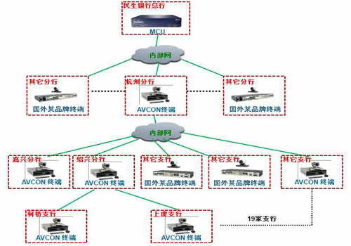 華平視頻會議系統(tǒng)應(yīng)用于民生銀行杭州分行以及下屬兩家三級分行和19家支行。其中杭州分行高清主會場采用AVCON CS2800全高清終端,融合高清視頻編解碼、寬頻語音等技術(shù),提供1080P全高清畫質(zhì)的交互體驗(yàn),實(shí)現(xiàn)與分行華平視頻終端以及其他品牌視頻終端的接入,從而實(shí)現(xiàn)總行、分行、支行的三級視頻會議。