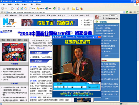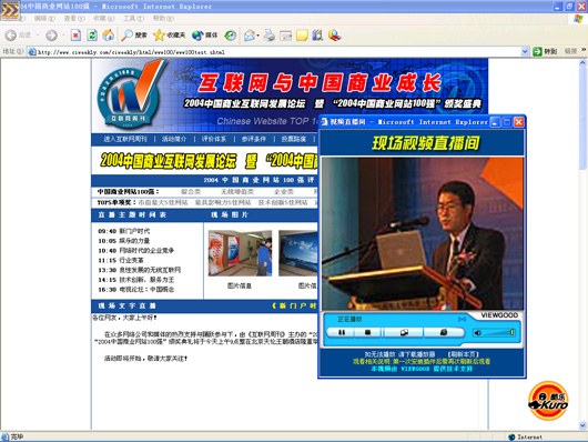 作為此次活動全程流媒體直播技術(shù)提供商VIEWGOOD(www.viewgood.com)商務(wù)主管在活動現(xiàn)場說:“中國大陸的上網(wǎng)用戶總?cè)藬?shù)即將突破1億,中外商業(yè)網(wǎng)站的資本運作空前活躍,3G、IPv6等新技術(shù)將催生互聯(lián)網(wǎng)的新一輪變革,網(wǎng)絡(luò)媒體正在從“第四媒體”快速走向“第一媒體”,致力為中國互聯(lián)網(wǎng)媒體服務(wù)的VIEWGOOD和所有的網(wǎng)站一樣,既面臨著激烈的挑戰(zhàn),更面臨著難得的發(fā)展機遇。無論是成長最快的網(wǎng)站、最具潛力的網(wǎng)站,還是創(chuàng)新最佳的網(wǎng)站,都是VIEWGOOD的合作伙伴。我們將以國際最先進的流媒體技術(shù)服務(wù)于中國互聯(lián)網(wǎng)。”