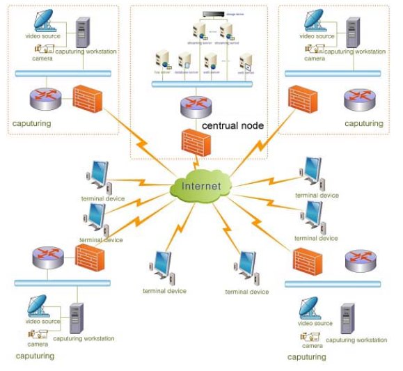 所有的部門的直播系統(tǒng)主要是進(jìn)行部隊(duì)演習(xí)、會(huì)議等現(xiàn)場(chǎng)的直播,直播信號(hào)通過WebLIVE視頻直播采集系統(tǒng)編碼壓縮,通過局域網(wǎng)上傳到中心機(jī)房,實(shí)時(shí)發(fā)布。采集同時(shí),將直播的數(shù)字信號(hào)存儲(chǔ)為AVI文件,上傳到放置在視頻點(diǎn)播服務(wù)器內(nèi),供其它地區(qū)的部隊(duì)指戰(zhàn)員進(jìn)行點(diǎn)播。