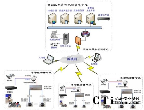 流媒體平臺(tái)采用分布式架構(gòu)部署,分為web服務(wù)器,數(shù)據(jù)庫服務(wù)器、直播服務(wù)器和流服務(wù)器,如有必要可在信息中心架設(shè)采集工作站搭建網(wǎng)絡(luò)電視或?qū)崨r直播應(yīng)用,在各個(gè)學(xué)校已經(jīng)部署錄播系統(tǒng)或直播系統(tǒng)的教室配置流媒體功能組件,這樣錄播實(shí)況可以實(shí)時(shí)傳送到流媒體平臺(tái)管理中心的全局直播服務(wù)器上,同時(shí)錄播的學(xué)校本色課件也可以上傳存儲(chǔ)到金山區(qū)教育局信息中心的流存儲(chǔ)服務(wù)器上,方便今后的檢索、點(diǎn)播、評(píng)估等各種應(yīng)用。