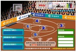 場(chǎng)地分成 5 個(gè)區(qū)域,分別對(duì)應(yīng) 1 - 5 ,想在哪個(gè)區(qū)域投籃就按電話機(jī)上對(duì)應(yīng)的 1-5 號(hào)鍵或直接在手機(jī)上寫短信區(qū)域號(hào)( 1-5 )發(fā)送到短信號(hào)碼,即可完成一次進(jìn)攻,投中后即可可獲得獎(jiǎng)品。本游戲由電視臺(tái)、網(wǎng)站與電信運(yùn)營(yíng)商聯(lián)合經(jīng)營(yíng)的電信增值業(yè)務(wù),由電視臺(tái)提供頻道向電視觀眾播出游戲畫(huà)面(含圖像和聲音),電信運(yùn)營(yíng)商提供電話線路和短信通道,參與者通過(guò)固定電話、小靈通和手機(jī)參與游戲,運(yùn)營(yíng)方通過(guò)收取固定電話、小靈通和手機(jī)的信息費(fèi)實(shí)現(xiàn)盈利。
