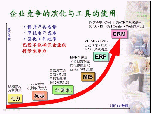 如此龐大的系統(tǒng)以信息技術(shù)角度來看,確實已經(jīng)涵蓋了企業(yè)日常營運作業(yè)的6、7成以上,因此,很多企業(yè)的主管甚或MIS主管認(rèn)為建置了ERP系統(tǒng)之后其實就已經(jīng)作好企業(yè)e化的工作了,其實仔細思考之后您會發(fā)覺ERP系統(tǒng)還是有其功能限制之處,以業(yè)務(wù)單位之銷售工作推展為例,所能享受到的e化成果真是少之又少,許多業(yè)務(wù)人員平日最常運用到ERP系統(tǒng)大都為訂單管理部份,只有少部份的業(yè)務(wù)人員同時會運用到ERP系統(tǒng)中之報價功能,尤其ERP系統(tǒng)對業(yè)務(wù)人員在開發(fā)潛在客戶或作好案例管理方面之應(yīng)用更是幫助有限。