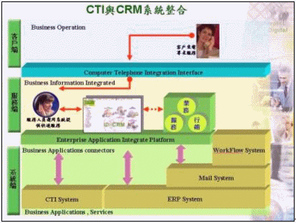 但傳統(tǒng)的CTI系統(tǒng)其重點乃是著重在服務(wù)工作的自動化方面,只提供簡單的客戶來電訊息提示,對于客戶進一步的背景資料、嗜好、購買需求及歷史往來記錄并不清楚也無法實時得知,更別說想藉由CTI系統(tǒng)來提供客戶個人化的服務(wù)、有效節(jié)省通話時間、刺激其潛在的購買需求,為了達成上述的目標(biāo),唯有將CTI系統(tǒng)與CRM系統(tǒng)進行整合,如此,客戶服務(wù)的質(zhì)量才可能達成某個程度的提升,而良好的客戶關(guān)系管理也將是未來呼叫中心運作成功與否的關(guān)鍵所在。