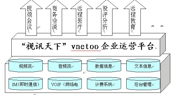 VNETOO視訊運(yùn)營平臺具有強(qiáng)大的數(shù)據(jù)功能和優(yōu)質(zhì)的音視頻效果,是集"視頻+語音+數(shù)據(jù)+IM(即時(shí)通信)+VOIP(網(wǎng)絡(luò)電話)+計(jì)費(fèi)+后臺管理"的基于IP網(wǎng)絡(luò)世界一流視訊服務(wù)提供平臺,它革命性地開創(chuàng)了視訊運(yùn)營領(lǐng)域的全新模式。(見圖表一:"視訊天下"vnetoo運(yùn)營平臺結(jié)構(gòu))。