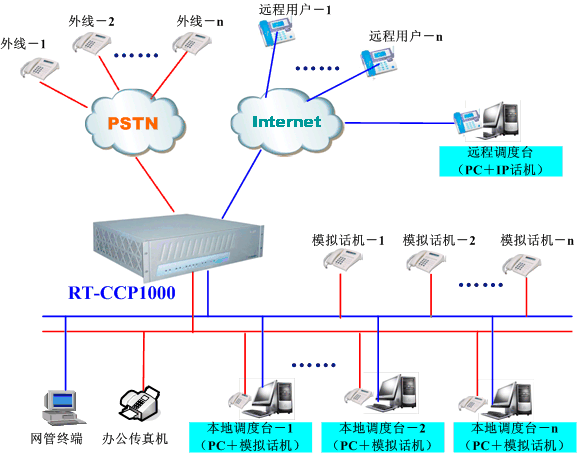 融天科技一體化IP調度指揮系統(tǒng)RT-CCP1000充分融入了先進的VOIP技術,支持遠程IP用戶接入/遠程調度模式,該調度系統(tǒng)可廣泛地適用于部隊、鐵路、水力、電力、航空、礦山、石油、冶金、化工等企業(yè)與單位,系統(tǒng)組網(wǎng)圖大致如下: