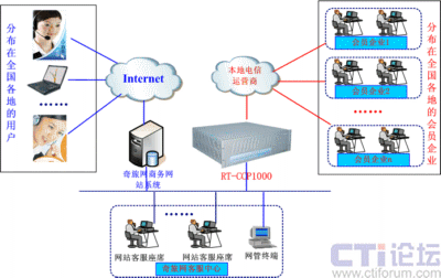 融天科技采用自主研發(fā)的融合通信平臺(tái)RT-CCP1000設(shè)備一套為奇旅網(wǎng)部署了一套Web-call聯(lián)絡(luò)中心。RT-CCP1000集傳統(tǒng)PBX、IP-PBX、CTI、IVR、DB、VOIP、錄音、傳真等服務(wù)于一體,以模塊化的形式提供用戶(hù)所需的各種功能,是一套功能強(qiáng)大的一體化融合通信平臺(tái),安裝部署非常方便,維護(hù)管理非常簡(jiǎn)單。該方案中,與本地電信運(yùn)營(yíng)商采用數(shù)字中繼E1接口和模擬中繼FXO接口方式連接,軟電話以控件方式嵌入到奇旅網(wǎng)公司的商務(wù)網(wǎng)站上, RT-CCP1000將接收所有以該控件方式來(lái)至Internet來(lái)的呼叫,并通過(guò)與電信運(yùn)營(yíng)商接口呼叫相關(guān)會(huì)員企業(yè)綁定的聯(lián)絡(luò)電話,這樣就實(shí)現(xiàn)了上網(wǎng)用戶(hù)通過(guò)電腦與會(huì)員企業(yè)免費(fèi)進(jìn)行直接聯(lián)絡(luò)。網(wǎng)絡(luò)拓?fù)鋱D如下: