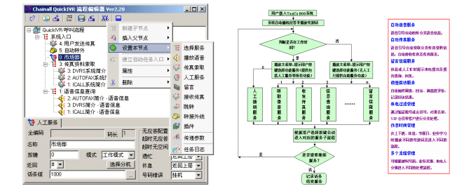 產(chǎn)品化、標(biāo)準(zhǔn)化、全功能、低價(jià)位,易于安裝使用,便于應(yīng)用集成,為用戶實(shí)現(xiàn)呼叫中心應(yīng)用節(jié)省了大量的資金、人力、時(shí)間;無需編程,可自定義呼叫服務(wù)流程,豐富的業(yè)務(wù)插件可以直接配置訪問后臺(tái)數(shù)據(jù)庫,滿足各類應(yīng)用需要;組件式構(gòu)造,易于擴(kuò)容和功能擴(kuò)展。