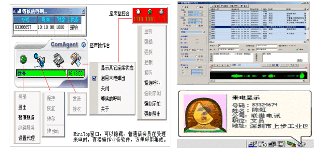 座席操作界面分類設(shè)計(jì)為Mini Top方式,可隨時(shí)隱藏或顯示;座席控件將來電號碼或在流程中收集的信息通過事件傳遞給業(yè)務(wù)系統(tǒng),話務(wù)員受理來電時(shí),直接看到的是業(yè)務(wù)處理界面。