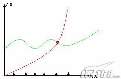 我們可以看到,投入和產(chǎn)出是按月增長的,那么億美目前呢,是(綠線)慢慢增長的一個(gè)曲線,隨著投入增加,持續(xù)是一個(gè)規(guī)模性的增長。這類似一個(gè)2003-2005年,持續(xù)是這樣一個(gè)營銷型的穩(wěn)步增長。那么,從2006年開始,這個(gè)地方(棕色)的出現(xiàn),開始出現(xiàn)新的變化和新的增長方式,那么我們說這個(gè)點(diǎn)叫做拐點(diǎn)。那么傾斜角度和產(chǎn)出就發(fā)生了變化了。那么比如今后發(fā)展到一個(gè)階段,新的平臺(tái),新的內(nèi)容出來后,那么這個(gè)拐點(diǎn)也同樣會(huì)發(fā)生變化。